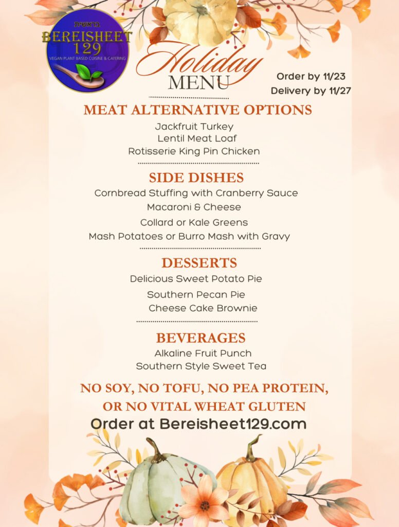 Hello and welcome to Bereisheet 129 Vegan Plant-Based Cuisine & Catering. It is our pleasure to serve you and your family! Whether you are transitioning to a plant-based lifestyle or in need of assistance while on your plant-based journey, we are here to serve you.
